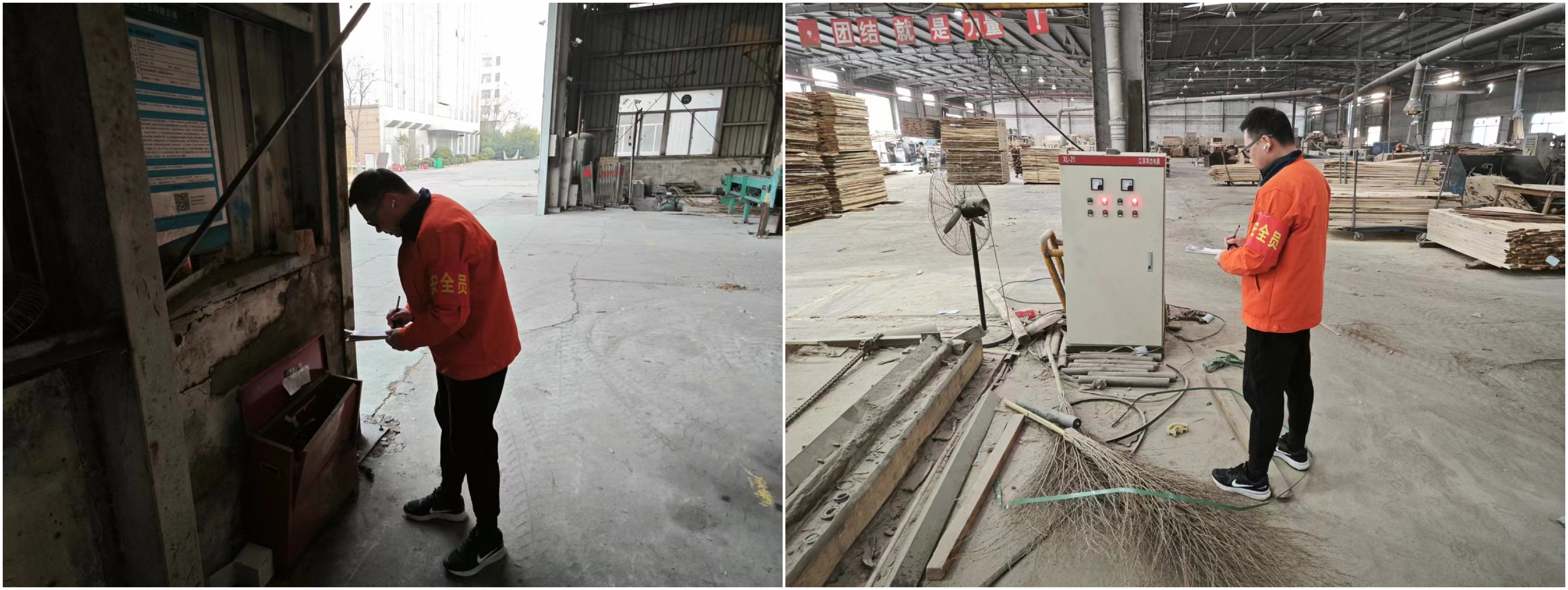 靖江国林木业有限公司结合公司实际,发动公司各个相关部门成立联合工作小组,层层压实安全生产责任,对工厂内各单位现场安全作业情况进行安全隐患排查,发现隐患立即整改,严守安全生产红线。