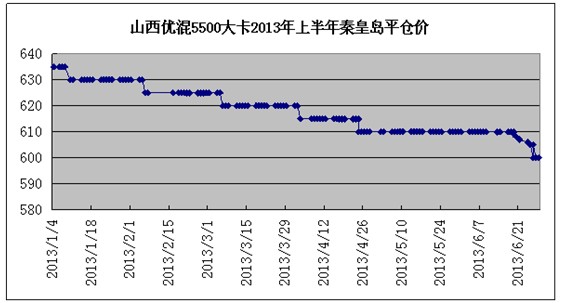 2013年由于全球大宗商品市场低迷,国内煤炭价格也持续走低。加上近期金融市场“钱荒”,预计多数银行将收紧“非必要性”贷款业务,对于原本已受重点监管的钢铁、建材、煤炭等“两高一资”行业和部分中小企业而言,未来贷款需求难免会受挤压,还贷压力也将加大。为此,一些贷款额度较高、资金链偏紧的贸易商已开始择机低价出货套现。下图为2013年1-6月秦皇岛港5500大卡山西优混煤的平仓价走势图。