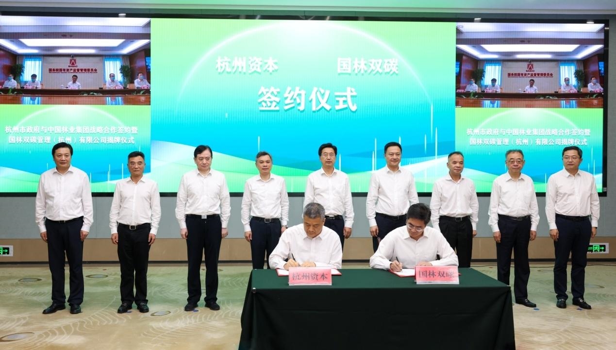 6月10日,中林集团与杭州市政府战略合作签约暨国林双碳管理(杭州)有限公司(以下简称“双碳”公司)揭牌仪式在北京、杭州两地以视频连线方式举行。国务院国资委党委委员、副主任翁杰明,浙江省委常委、常务副省长陈金彪,浙江省委常委、杭州市委书记刘捷,杭州市委副书记、市长刘忻,中林集团党委书记、董事长余红辉,中国国新党委书记、董事长周渝波,杭州市委常委、秘书长朱华,杭州市副市长胡伟出席。