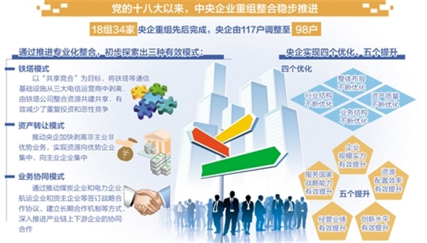 党的十八大以来,中央企业的重组整合,成为国企改革的重要内容。5年来,中央企业的重组整合稳步推进,国务院国资委先后完成18组34家央企重组,央企由117户调整至98户。