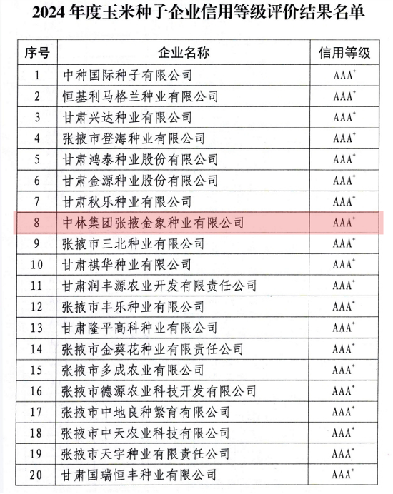 中林集团张掖金象种业 | 连续八年获评AAA+信用等级制种企业持续领航种业高质量发展