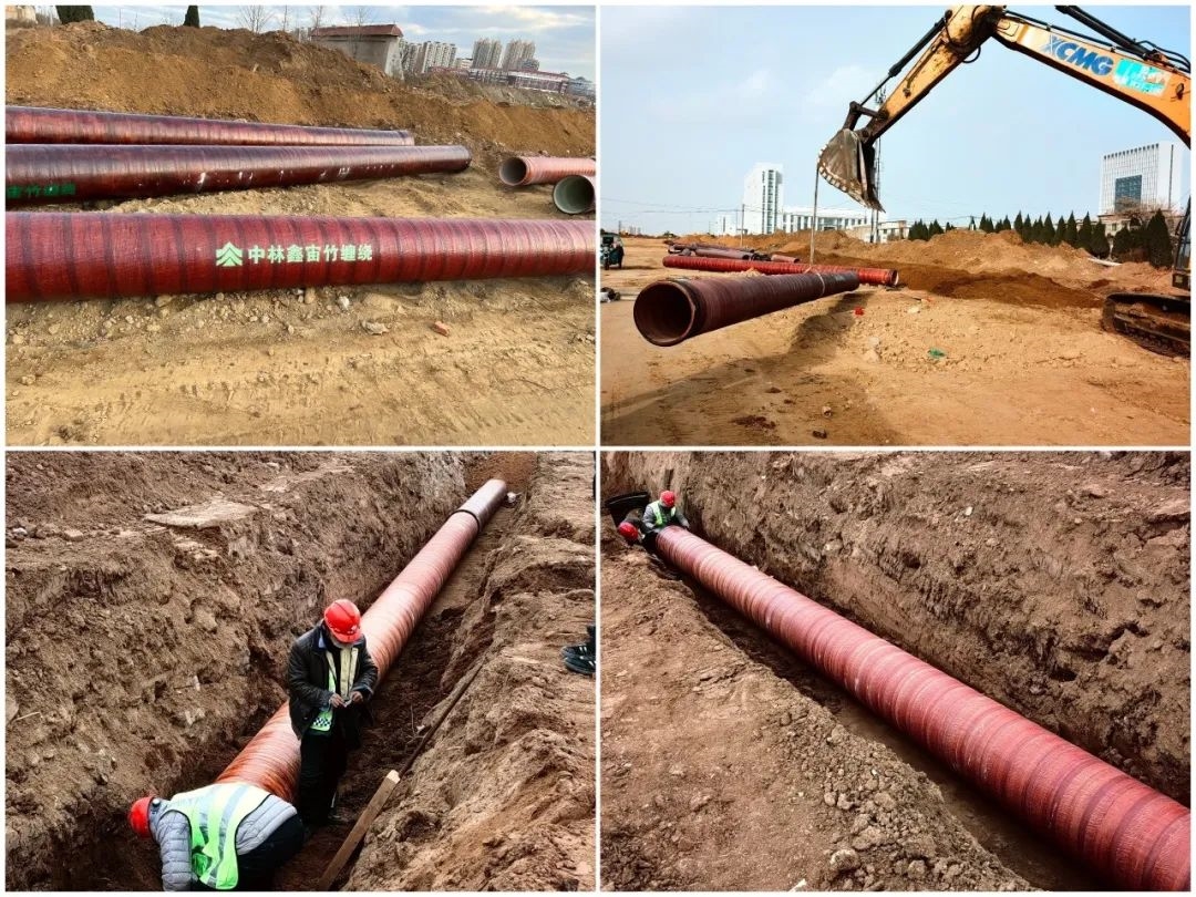 这是2022年12月11日,中林鑫宙竹缠绕发展有限公司生产的竹缠绕复合管道在烟台蓬莱区新港路建设的敷设现场。本次敷设是中林集团竹缠绕复合管首次大量应用于烟台市市政工程。