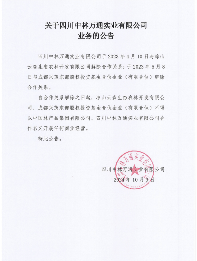 关于四川中林万通实业有限公司业务的公告