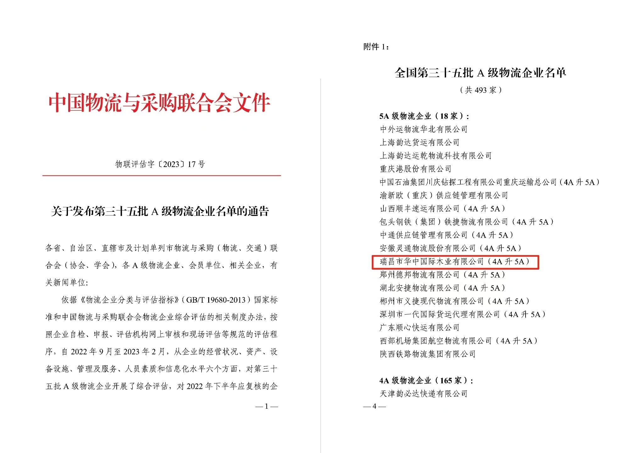 2月20日,中国物流与采购联合会发布全国第三十五批A级物流企业名单,瑞昌市华中国际木业有限公司通过国家5A级物流企业综合评审,成为了国家5A级物流企业之一。
