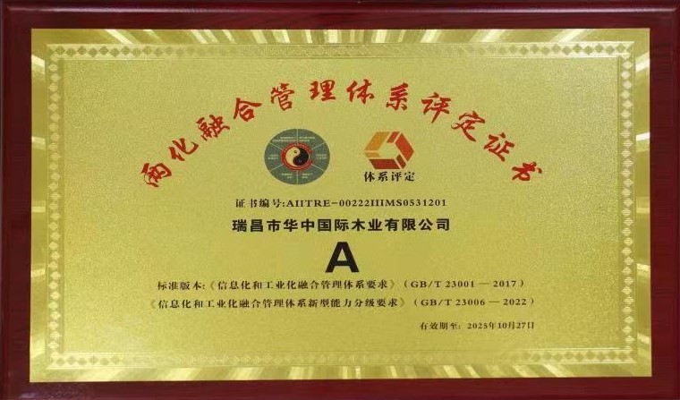 近日,瑞昌市华中国际木业有限公司顺利通过国家工业和信息化部《信息化和工业化融合管理体系要求》《数字化转型参考架构》体系认证审核,获得两化融合管理体系A级评定证书,标志着瑞昌华中公司在推进信息化和工业化融合发展方面取得了新的突破。