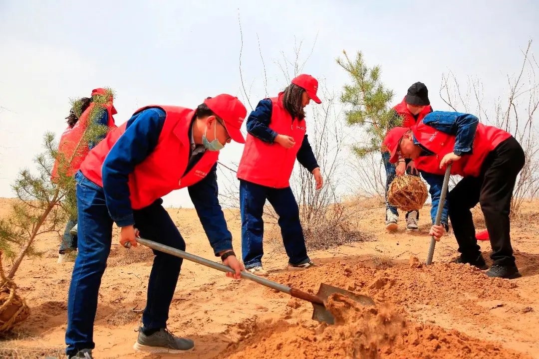 △2023年4月12日,志愿者在宁夏灵武白芨滩国家级自然保护区开展义务植树、扎草方格。