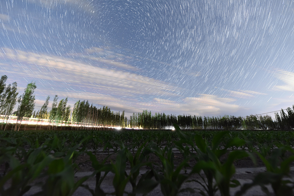 △新疆巴州和静县哈尔莫敦镇查茨村高标准农田防护林的夏日星空夜景