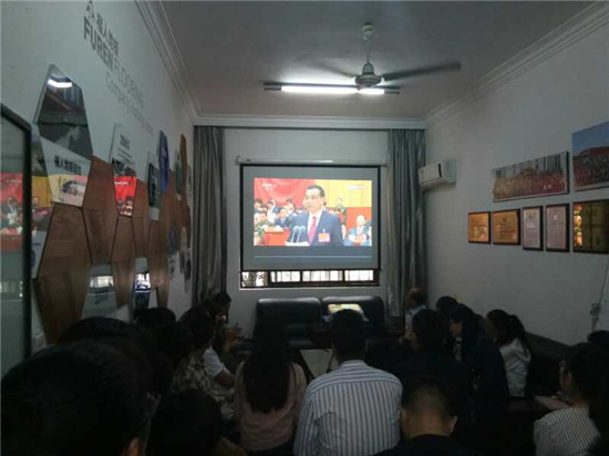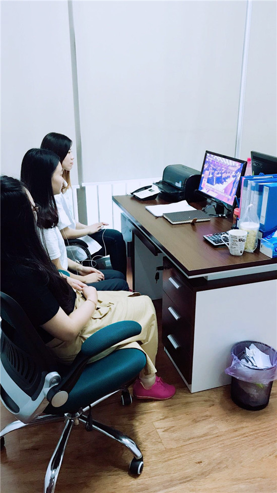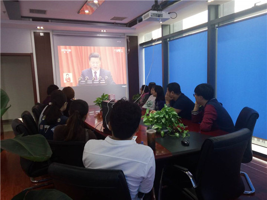 在中国林产工业公司大家庭里也洋溢着饱满的爱党爱国热情。上午9点,伴随着雄壮的国歌声,分布在林产公司本部及下属企业近10个不同地域的近60名党员、团员和上百名干部职工,通过电视、手机、电脑、收音机等第一时间收听、收看十九大开幕会实况转播。
