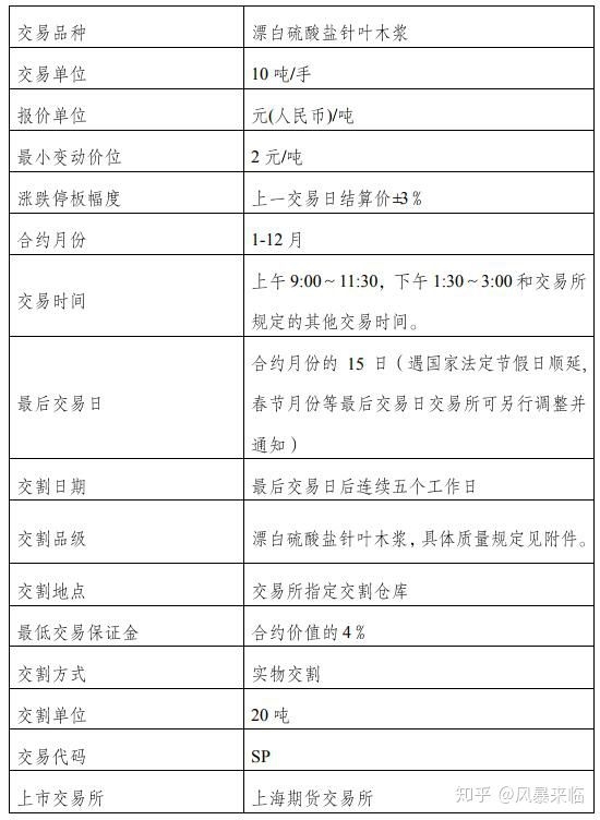 交割质量规定:交割品的抗张指数、耐破指数和撕裂指数等三个指标应当符合或优于QB/T1678-2017《漂白硫酸盐木浆中针叶木浆》中的针叶木浆一等品质量规定,具体的指标抗张力大于87%,耐破大于5%,撕裂大于8%,交割漂针浆应当是交易所认可的生产厂生产的指定品牌的正品浆。