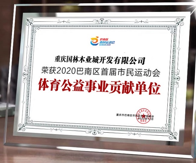 重庆国林木业城开发有限公司作为国有企业,积极主动履行社会责任,热心体育公益事业,大力支持巴南区市民运动会。在运动会颁奖仪式上,获评“2020巴南区首届市民运动会体育公益事业贡献单位”。重庆国林执行董事魏健洋出席了颁奖典礼并接过了奖牌。