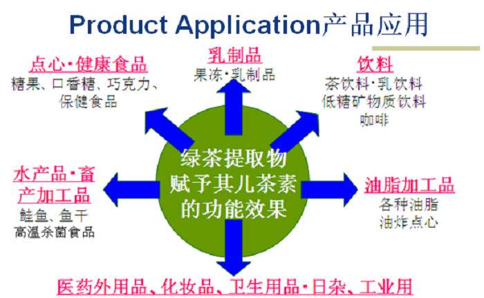 基于人们追求清新自然,绿色健康的需求前提,公司利用先进的膜分离法提取生产的健康产品,极具健康、自然的特性,符合当今社会的追求。其中EGCg 单体是一种新食品原料,对提高和维持身体健康起着多种效用,特别是在抗氧化,消除人体自由基,提高免疫力等方面起着重要作用;速溶茶粉具有绿茶的独特自然风味,富含丰富的儿茶素、氨基酸及人体所需的微量矿质元素;茶氨酸具有独特的生理活性,在降血压、放松神经、辅助抑制肿瘤方面有很好的作用。