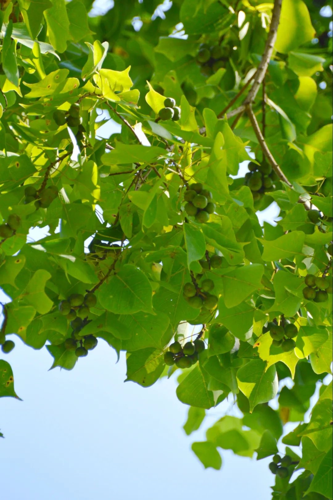 叶子落下后,露出串串“珍珠”,这就是木籽。籽实初青,成熟时变黑,外壳自行炸裂剥落,露出葡萄大,白色籽实。乌桕树的果实看起来很像杏子,成熟了挂在树上会吸引人们去采摘。可是这种果实是有毒的,大家可千万不能食用。