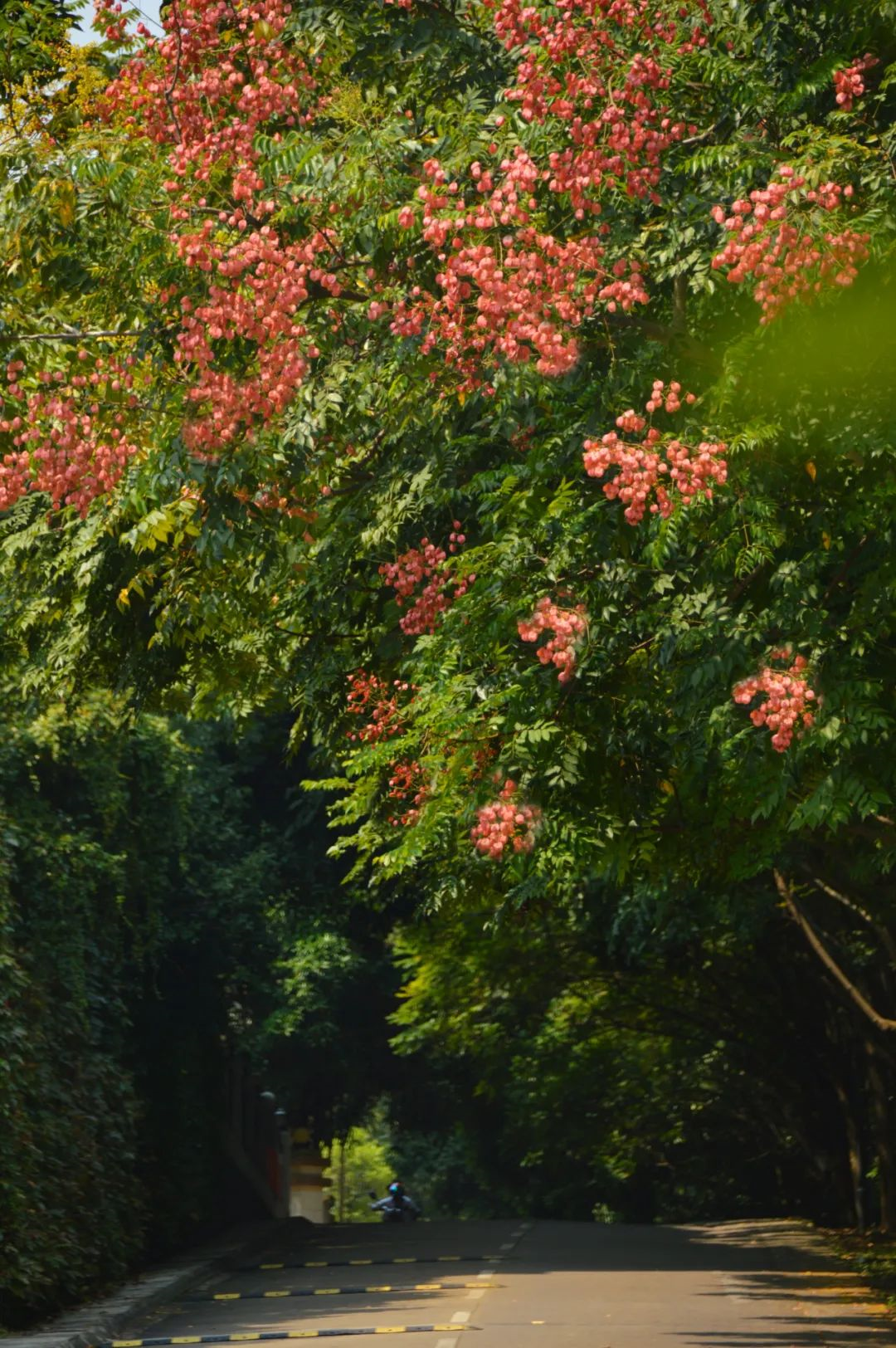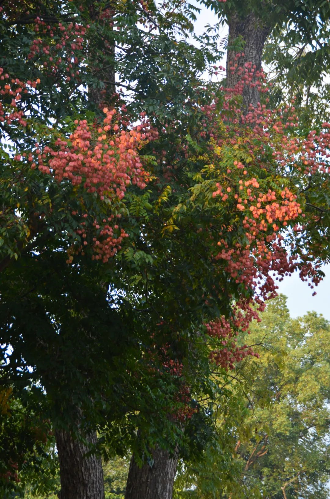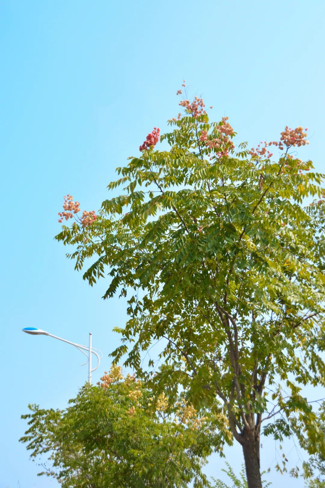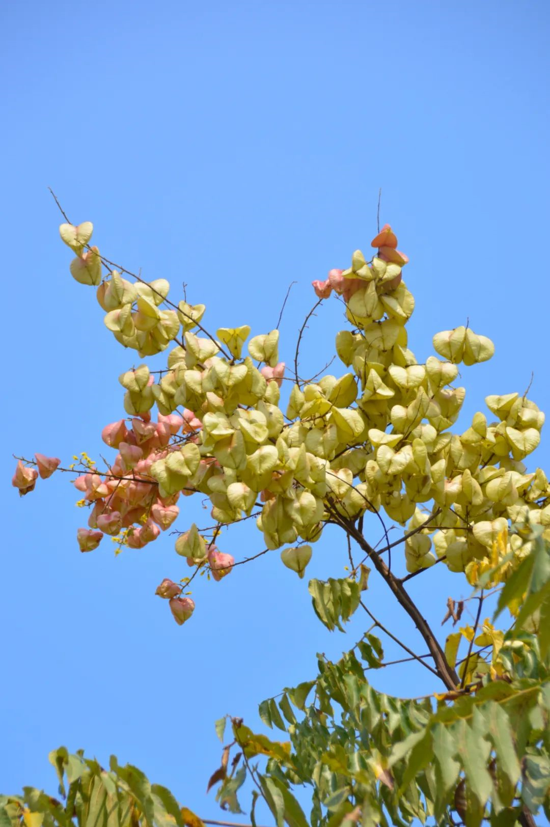 栾树的果实看起来如一盏盏粉红的小灯笼挂在树上,比它的花还要明艳美丽,因此它又被称为“灯笼树”。