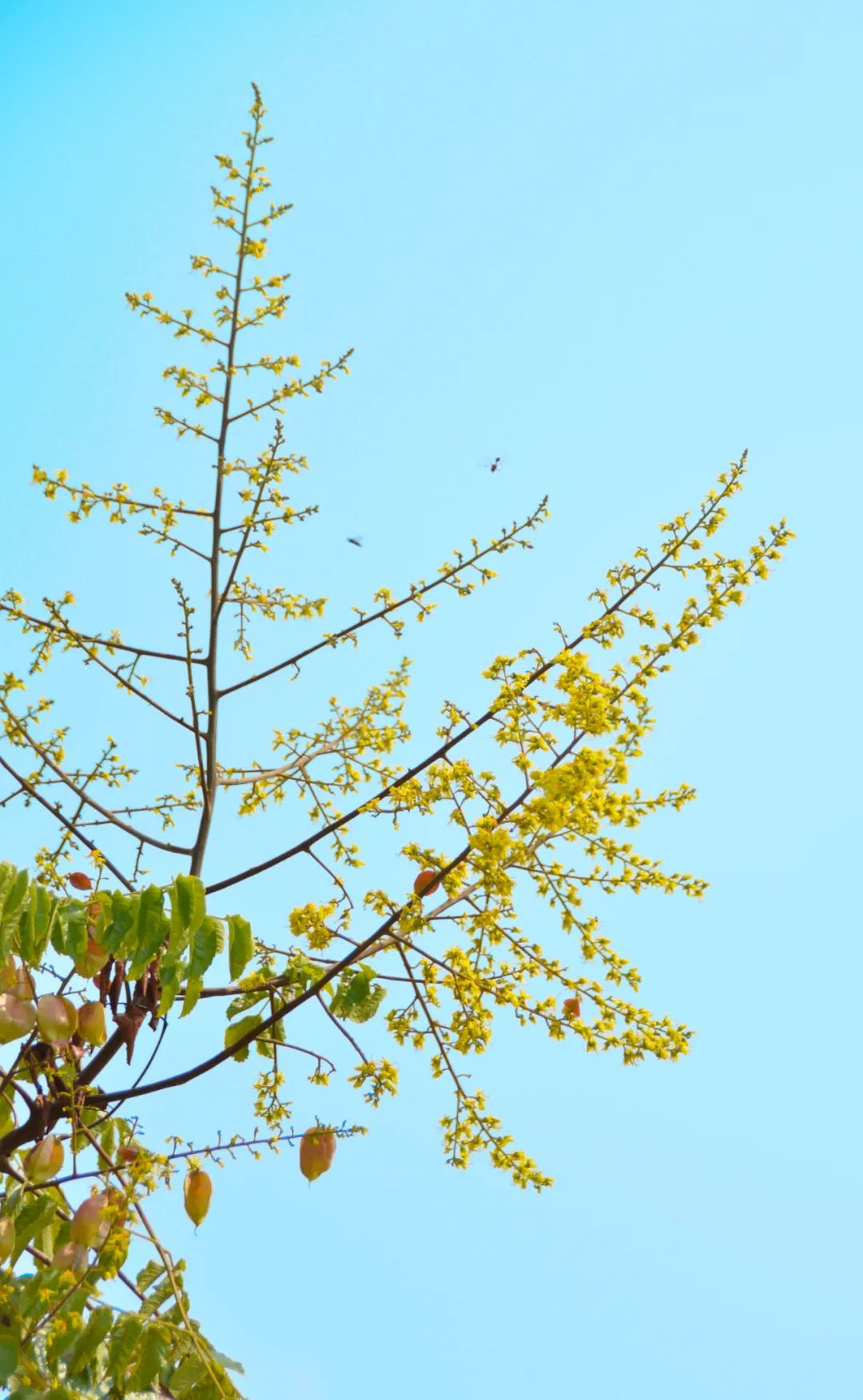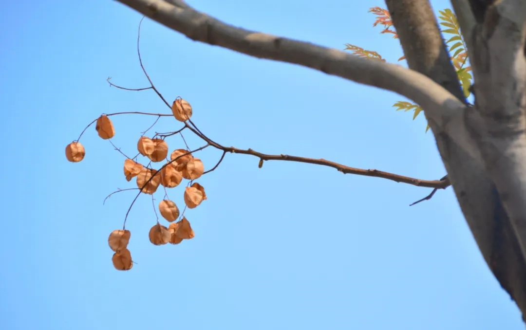 栾树一年四季都陪伴着我们,春天的它有着红色嫩叶,夏天的它开出黄花,秋天的它嫩叶变黄,冬天的它结出红果,每个季节的栾树都是不一样的亮丽风景。