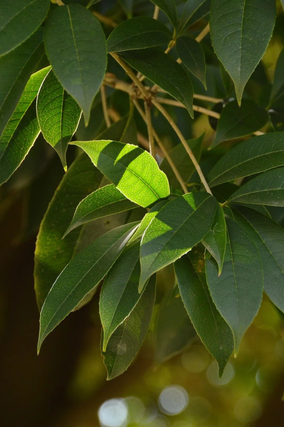 叶片革质,椭圆形、长椭圆形或椭圆状披针形。先端渐尖,基部渐狭呈楔形或宽楔形。全缘或通常上半部具细锯齿,两面无毛。腺点在两面连成小水泡状突起,中脉在上面凹入,下面凸起,侧脉在上面凹入,下面凸起,无毛。