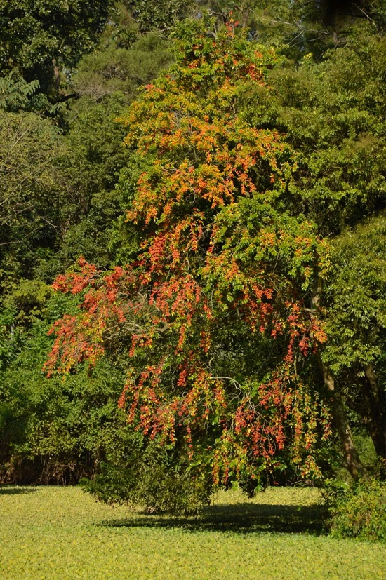 在良凤江国家森林公园的凤江绿野景区,有这样一种树,叫做铁冬青(学名:Ilex rotunda Thunb.),因冬季叶色依旧青翠而得名,是冬青科、冬青属植物。又被称为“万子千红树”,这个“万子千红”不是形容花朵,而是形容它的果实,寓意喜庆吉祥、人生丰收、家业兴旺。