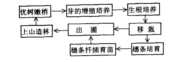 桉树优良无性系工厂化育苗主要以组织培养快速繁殖技术进行组培苗生产和以组培营养袋苗为母株建立采穗圃培育大量繁殖材料进行扦插育苗生产两部分。经对生产的各个环节进行总结筛选,将桉树优良无性系工厂化育苗生产流程概括为图1: