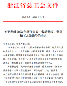 近日,浙江省总工会印发《关于表彰2023年浙江省五一劳动奖状、奖章和工人先锋号的决定》