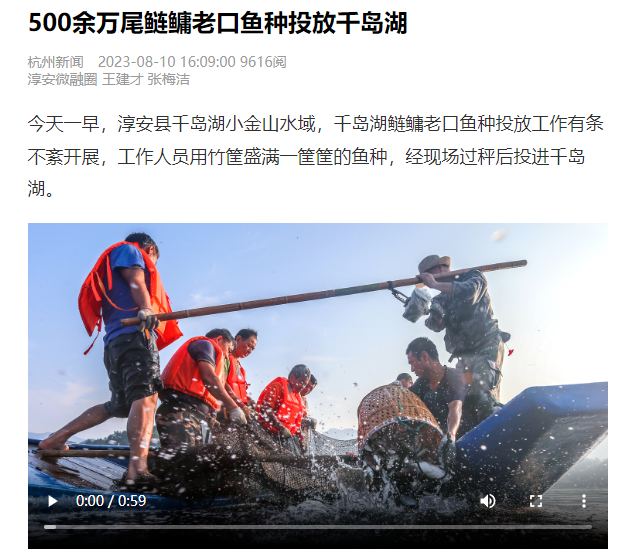 暑去秋来,今年的老口鱼种投放工作有条不紊开展。工作人员用竹筐盛满一筐筐的鱼种,经现场摇号抽样、电子过秤、自动数字记录后投进千岛湖。