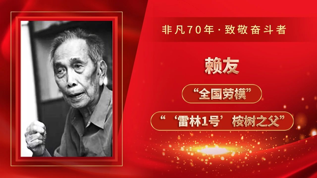 赖友何许人也?上世纪30年代的担盐工,饱受盐商欺压和剥削;上世纪40年代,成为进步青年参加革命运动;1954年,作为省林科院技术人员支援粤西林场(雷林公司),投身“绿化雷州半岛”建设;1979年,因桉树科研成绩突出,被授予“全国劳动模范”称号,成为雷林公司全国劳模第一人。