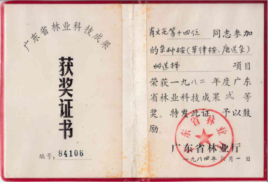 广东省林业厅授予肖文光等人科技成果二等奖(1982年度)