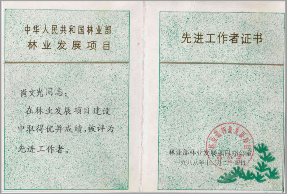 肖文光在林业部林业发展项目中被评为先进工作者(1988年度)