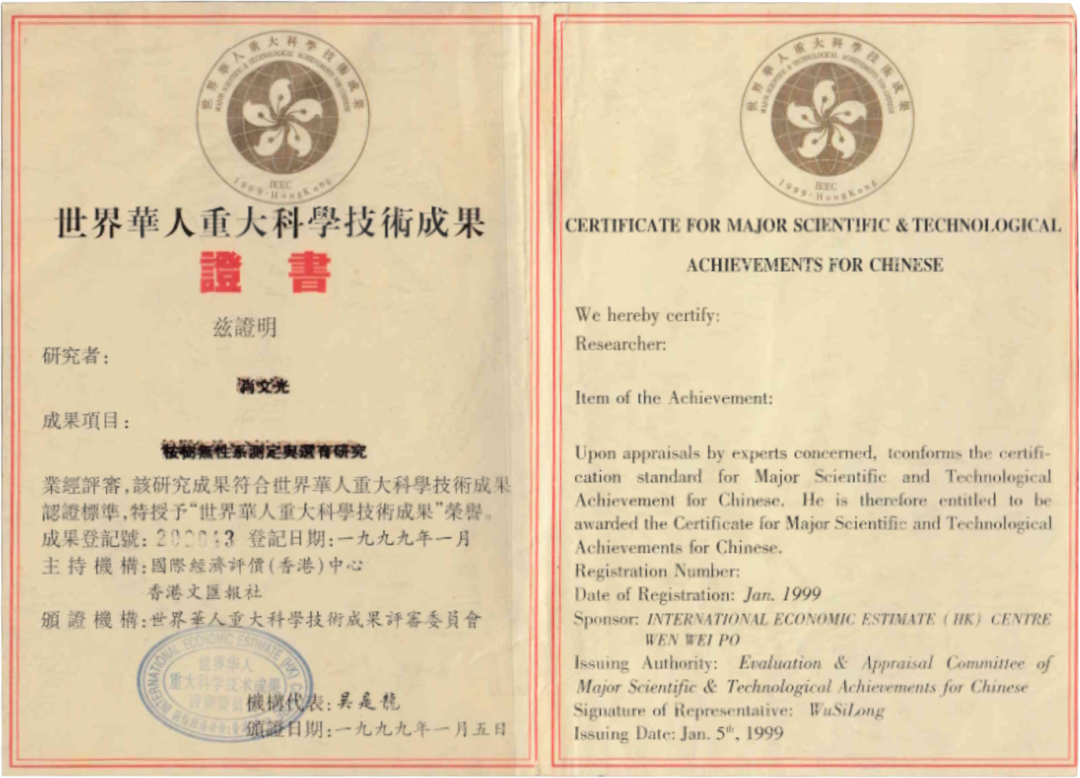 肖文光获“世界华人重大科学技术成果“荣誉(1999年度)