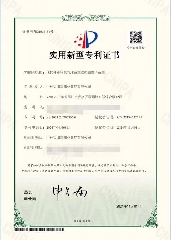 近日,雷林公司申报的国家实用新型专利“现代林业智慧管理系统监控预警子系统”获得国家知识产权局授权。