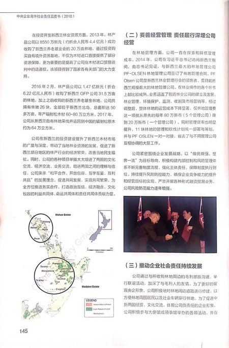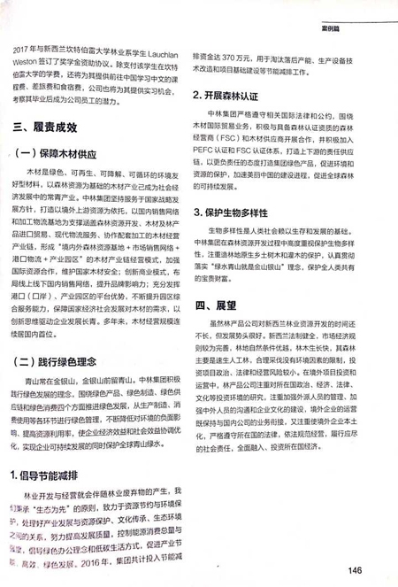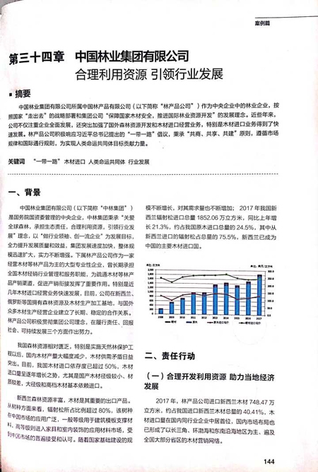 集团公司编写的《合理利用资源 引领行业发展》被收录本年度蓝皮书。编委会充分肯定了集团所属林产品公司积极响应习近平总书记提出的“一带一路”倡议,秉承“共商、共享、共建”原则,遵循市场规律和国际通行规则,依法合规开展国际化经营,不仅促进了当地林业行业健康发展,改善当地民生福祉,更有效提高了中国林业企业木材进口贸易谈判中的话语权,为促进全球森林经营可持续发展做出了重要贡献。