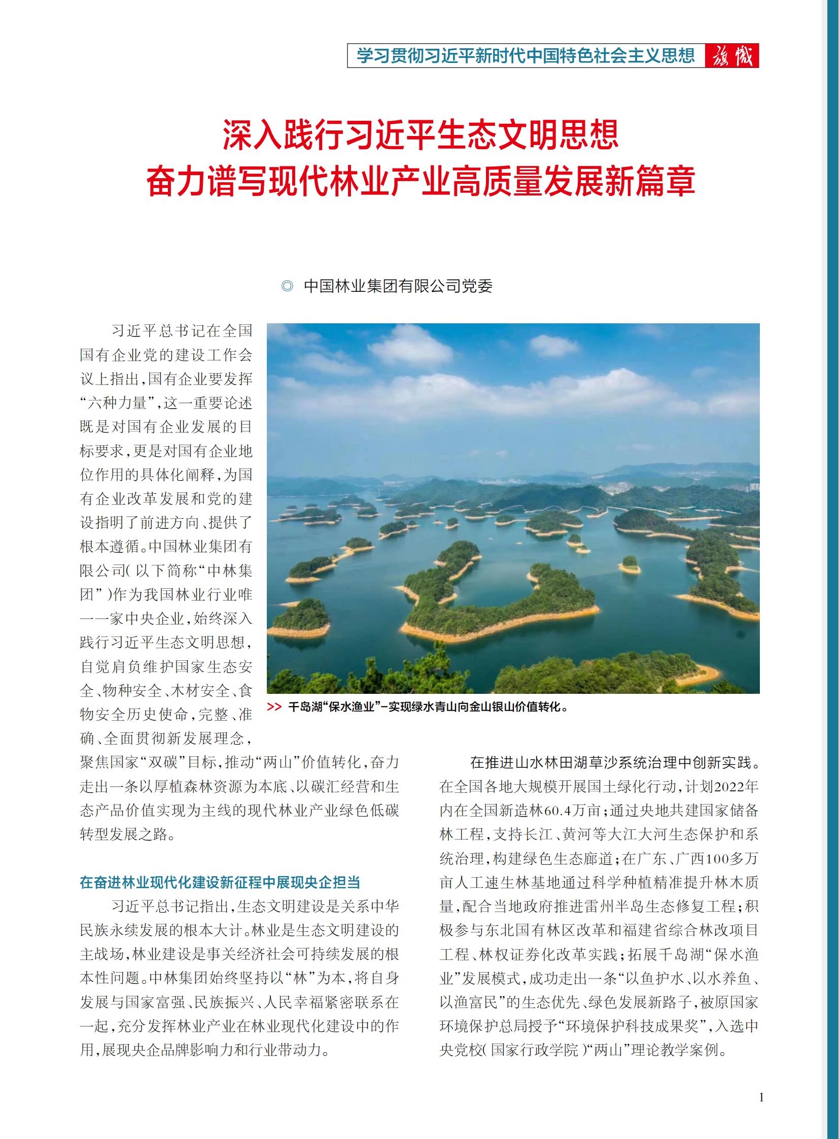 习近平总书记强调,坚持党的领导、加强党的建设,是我国国有企业的光荣传统,是国有企业的“根”和“魂”。中林集团党委始终坚持党的领导,加强党的建设,强根铸魂,提质增效,致力于打造国内最大碳汇经营实体和生态产品价值实现重要运营平台,以高质量党建引领保障企业高质量发展。近日,《旗帜》杂志2022年第10期刊发vwin网址链接 党委署名文章《深入践行习近平生态文明思想 奋力谱写现代林业产业高质量发展新篇章》,现将全文分享如下: