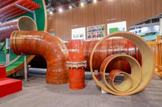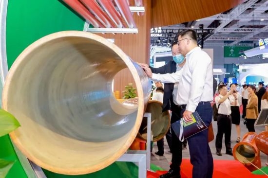 近年来,中林集团不断加强竹缠绕新型复合材料研发,为生物减碳固碳提供重要解决方案。在现场,一个直径为3.6m,长3m的竹缠绕管廊吸引了大家的注意,它是“以竹代塑”绿色低碳材料应用的创新与突破。与传统管廊相比,竹缠绕管廊材料成本可降低约10%,安装施工效率可提高约20%。竹缠绕管廊于2022年7月,在住建部的建设行业科技成果评估中被评为“技术达到世界领先水平”,并列入“十四五”生物经济发展规划。