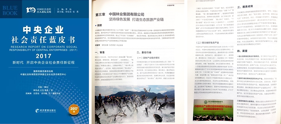 集团公司编写的《坚持绿色发展 打造生态旅游产业链》被收录蓝皮书。该书编委会充分肯定集团所属森林国际旅行社致力于推动森林旅游与传统旅游的融合。集团森旅所属千岛湖发展集团践行总书记“两山理论”,落实生态文明建设,大力发展森林生态旅游,实施“保水渔业”发展模式,推出了千岛湖“巨网捕鱼”、鱼拓艺术体验、“鳌山渔村”、徽派饮食文化之旅等生态旅游产品,为繁荣森林生态旅游事业和促进林业产业的转型发展做出了积极贡献。