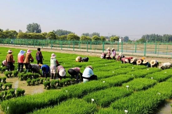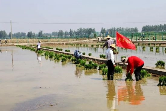 在平坦的稻田里,工人们辛苦劳作,转眼间,一块块空荡荡的黑土地披上了崭新的绿装。放眼望去,一棵棵秧苗挺立在水中,翠绿喜人,在风的吹拂下,像一串串跃动的音符,在稻田里交奏出最美的田园乐章,一幅辛勤劳作的初夏农耕图在田地里徐徐展开。